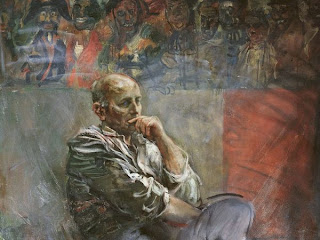 Rispondo qui a un commento al post di ieri, commento anonimo, tanto che ne approfitto per chiedere a tutti di firmare almeno con il nome proprio, ovvero lo pseudonimo, così colloco meglio domande e risposte. Mi chiedeva Anonimo di chiarire se il termine lambiccato fosse relativo alla immagine prescelta per il tema di ieri, cioè Testori, ovvero per l’autore dell’illustrazione, il pittore Giancarlo Vitali. Per rispondere mi tocca fare un passo indietro: le immagini che scelgo per i miei post certamente hanno attinenza con gli stessi, per non dire che in alcuni casi sono elemento portante delle mie note. Per cui la tua domanda, Anonimo, è pertinente assai. Certo, poi non bisogna far scattare degli automatismi, ovvero non possiamo parlare di causa-effetto. In questo caso, per andare sul pratico, mi è venuta in mente la prosa di Testori, per non dire la sua figura tout court, che era perlomeno contraddittoria da molteplici angoli, sia pur feconda e iridescente. Da lì ai ritratti del Vitali Giancarlo il passo è breve. Notate le rughe sulla fronte, tormentata dalla mano; splendido esempio di sofferenza artistica e di perizia del maestro bellanese. Sì, perché il Giancarlo Vitali è bellanese come l’Andrea, anzi i due se ne sono inventata una nuova: la collana “i Vitali”, dove l’uno scrive e l’altro illustra. Ne approfitto per farvi gustare un altro ritratto del pittore.