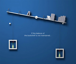 Ancora equi_libri con questa proposta di libreria che rimetto al vostro giudizio. Si tratta di “Maintain The Balance of Your Knowledge!” di Denis Oh (dal nome lo direi coreano), in pratica un sistema che si basa sull’equilibrio dei vostri tomi. Tanti di qui, tanti di là, si potrebbe dire. Certo, si può anche intervenire con i giusti contrappesi se non volete rischiare il tracollo del sistema. Chissà, forse è un modo per ricordare che i libri pesano, eccome, che la cultura, perlomeno quella di carta, si fa fatica a portarla a spasso; e anche a digerirla, aggiungo io. Oppure “Maintain The Balance” è giusto un modo per rappresentare visivamente che non tutti i libri sono uguali. Un po’ come in quest’altro esempio che avevo a suo tempo segnalato: là era la qualità a farla da padrone, qui, invece, il libro è ridotto alla sua essenza più fisica e immediata, il peso. E come scriveva il grande Michaelstaedter, il peso ha sempre fame del punto più basso.