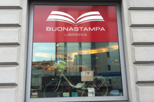 D’accordo, magari non si vede proprio benissimo, però il concetto è chiaro: anche se la primavera latita, in libreria Buonastampa gli appassionati delle due ruote sono i benvenuti, con tanto di sconto riservato a loro. La prova è proprio la vetrina qui proposta, che vede una Graziella del tempo che fu, simpaticamente messa a disposizione da A.Ri.BI, che con noi firma l’iniziativa, e diversi libri e proposte dedicate per l’appunto al mondo della bicicletta. Un motivo in più per venire a trovarci in Buonastampa.